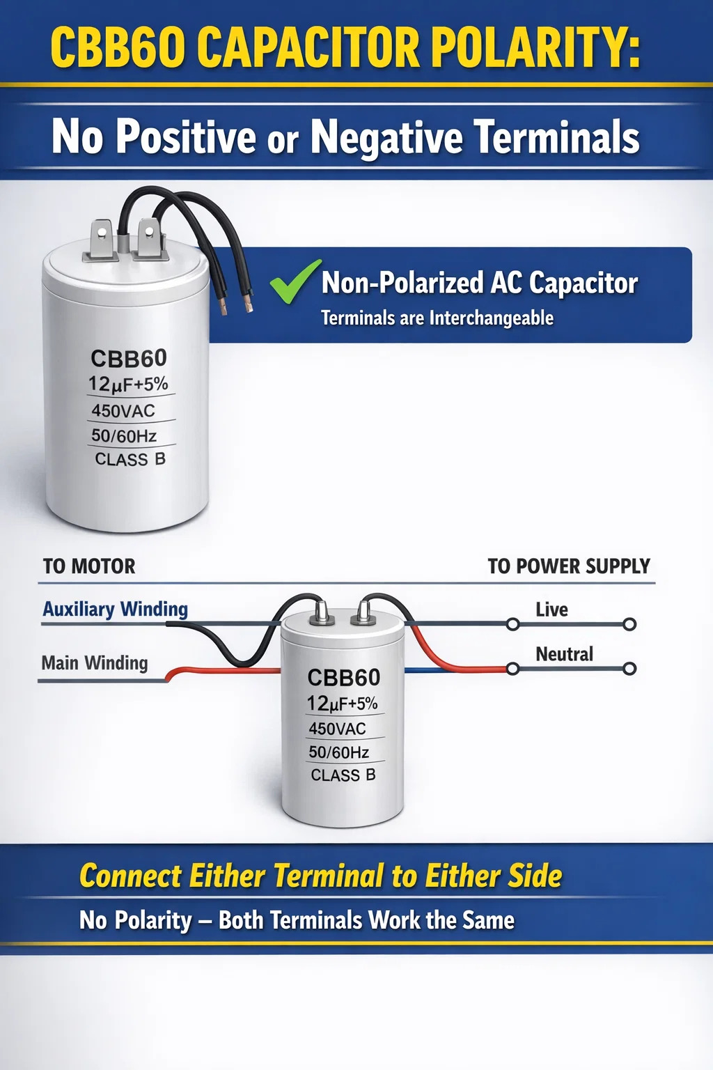 Kondenzátor CBB60 je ani pozitivní, ani negativní . Je to nepolarizovaný střídavý kondenzátor, což znamená, že nemá určenou kladnou ani zápornou svorku. Kteroukoli svorku můžete připojit na kteroukoli stranu obvodu bez rizika poškození nebo poruchy. Toto je jedna z nejzákladnějších charakteristik, která jej odlišuje od elektrolytických kondenzátorů, které jsou přísně polarizované a při nesprávném zapojení selžou – nebo dokonce explodují.