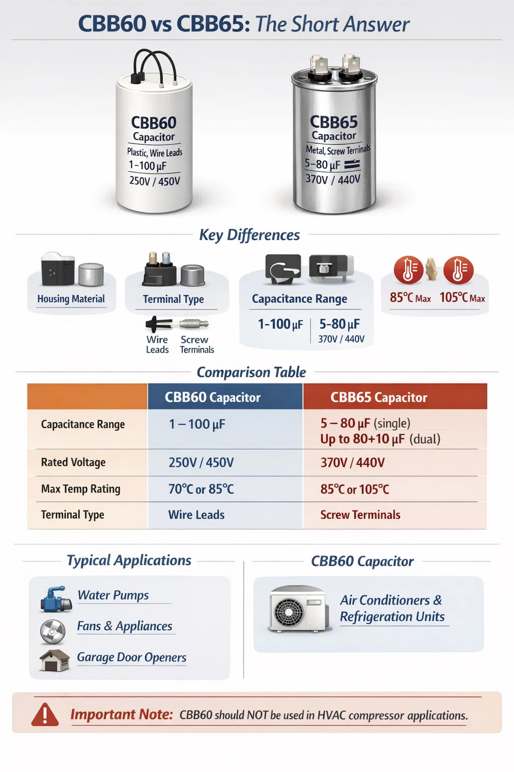 Stručně řečeno: CBB65 může nahradit CBB60 ve většině aplikací, ale CBB60 by neměl nahradit CBB65 v kompresorových aplikacích.