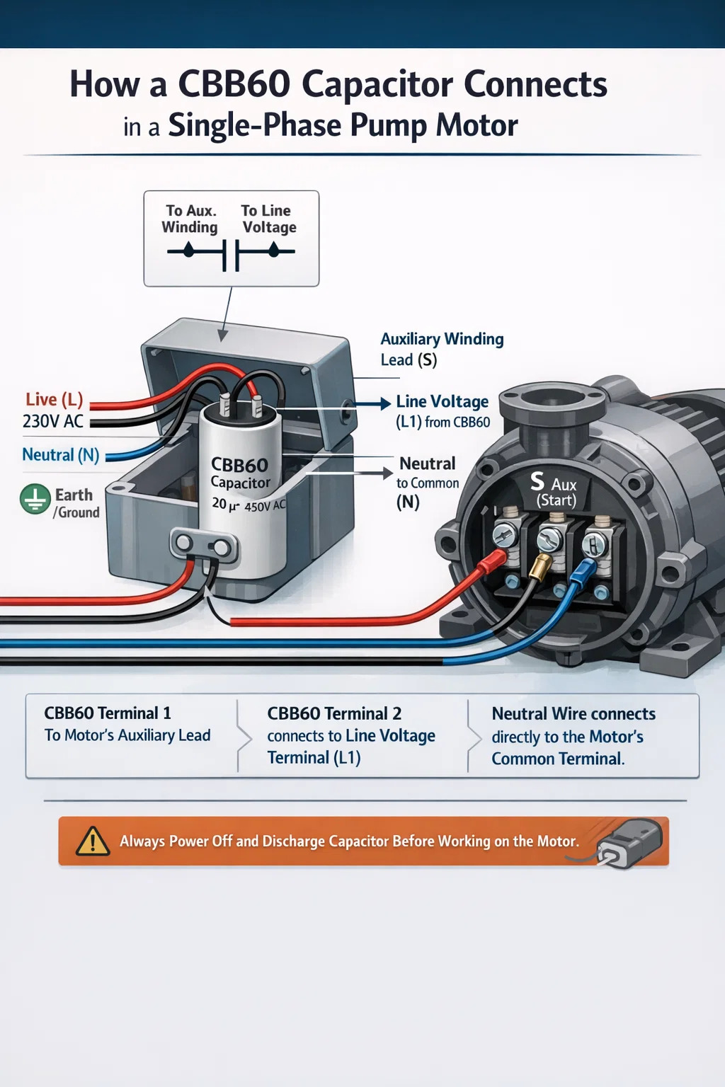 U nejběžnějšího scénáře — jednofázového motoru čerpadla s externím kondenzátorem — jak přívodní vodič pod proudem, tak pomocný vodič motoru dopadnou na CBB60, zatímco neutrál se připojí přímo ke společné svorce motoru. Motor běží, protože proud přes kondenzátor vede napájecí napětí zhruba o 90 stupňů a vytváří točivé magnetické pole, které jednofázové napájení samo o sobě nemůže vytvořit.