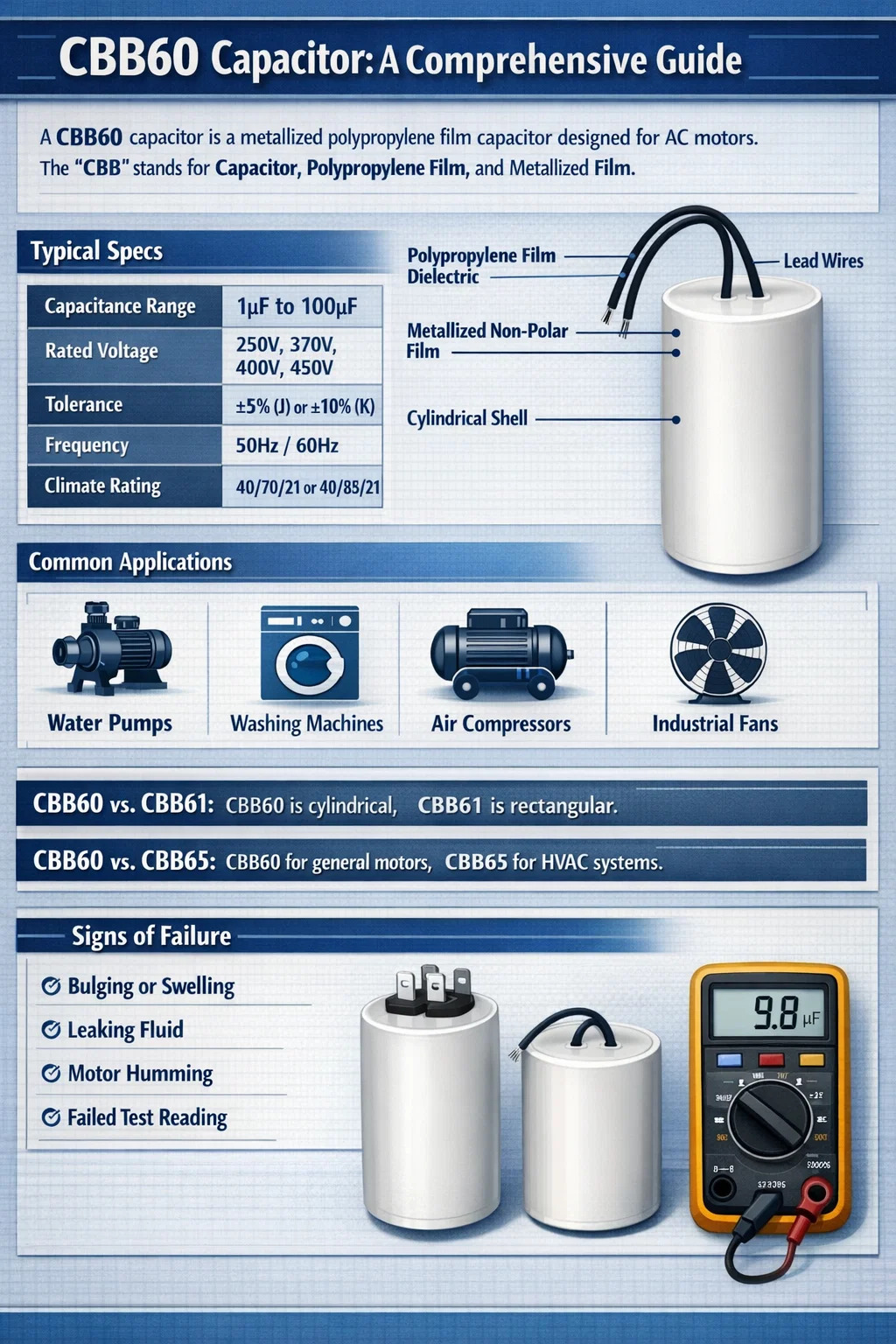 A kondenzátor CBB60 je specializovaný typ kondenzátoru z metalizované polypropylenové fólie určený především pro aplikace střídavých motorů. Označení "CBB" znamená jeho materiálové složení: "C" pro kondenzátor, "B" pro dielektrikum polypropylenové fólie a druhé "B" pro nepolární metalizovanou fólii. Tyto kondenzátory jsou oficiálně klasifikovány jako provozní kondenzátory, což znamená, že zůstávají v obvodu, když motor běží, aby udržely točivý moment a zlepšily účinnost.