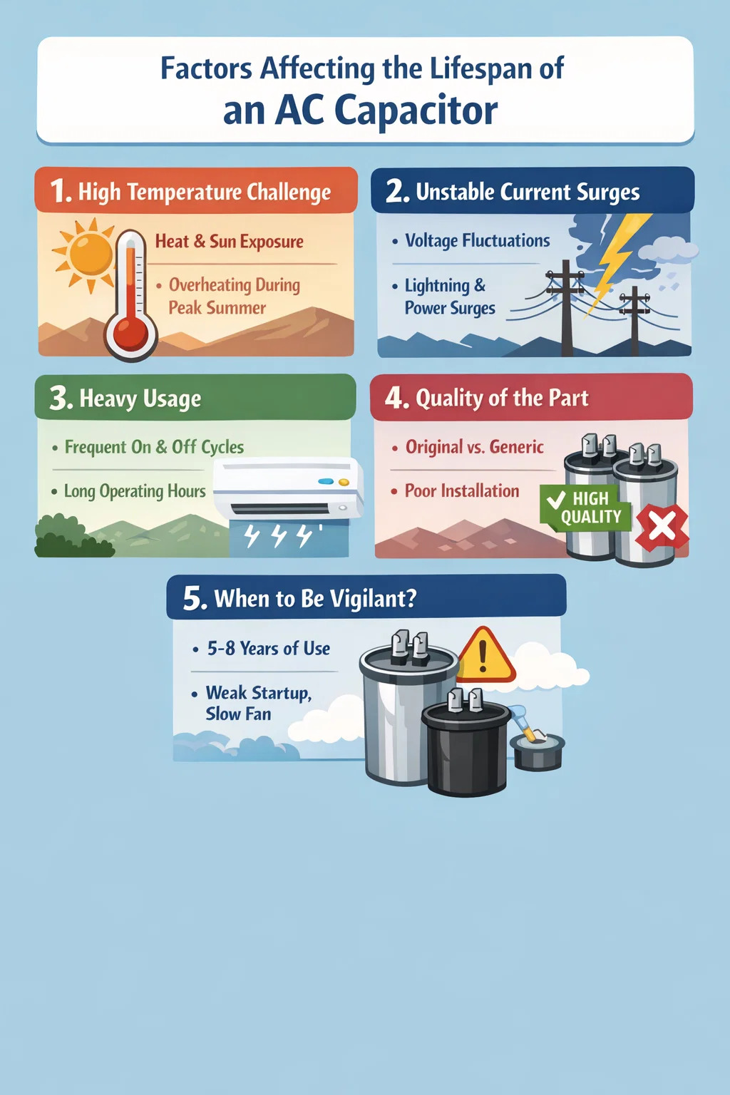 Počet startů: Kondenzátor pracuje nejvíce při spouštění. Pokud klimatizaci často zapínáte a vypínáte nebo pokud je termostat špatně nastaven, což způsobuje časté spouštění a zastavování kompresoru, AC kondenzátor se velmi rychle opotřebuje.